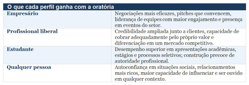 A oratória, nesse contexto, não substitui a competência técnica. Ela a amplifica. Funciona como o sistema de som de um instrumento que já era bom: não muda o que está sendo tocado, mas garante que todos na sala possam ouvi-lo.