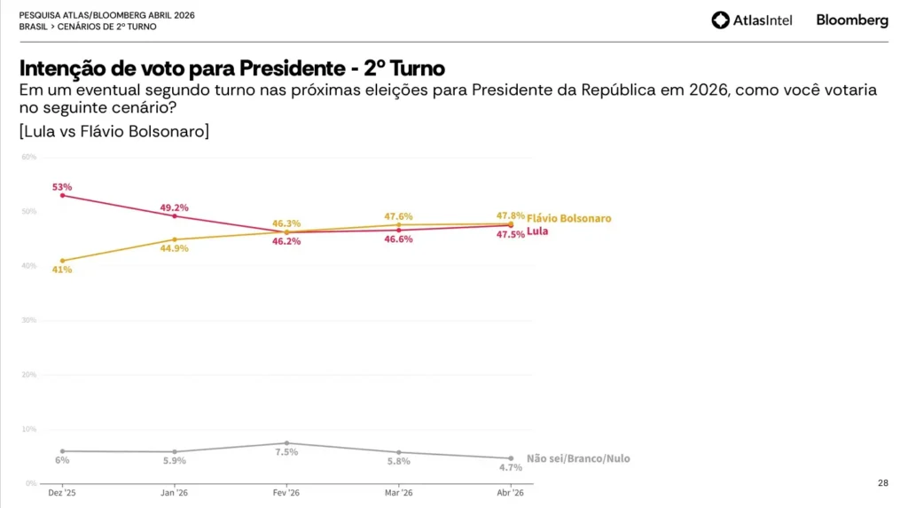28 de abril de 2026Levantamento indica polarização consolidada para o pleito de 2026; candidato do PL apresenta crescimento contínuo e atinge 47,8% das intenções de voto em cenário de segundo turno contra o atual presidente