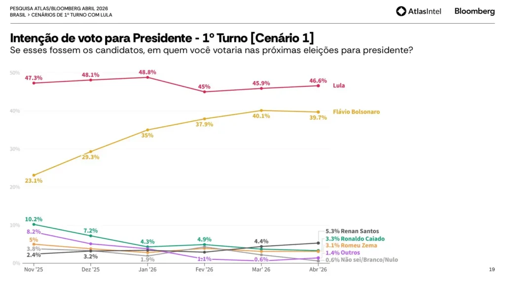 AtlasIntel: Lula lidera com 46,6%, mas Flávio encosta com 39,7% no 1º turno