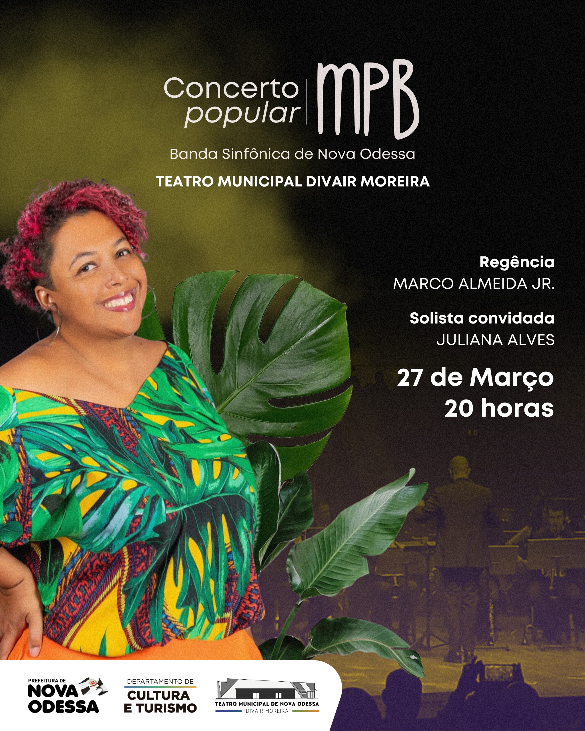27 de março de 2025 0 Por Redação Em NotíciaA Banda Sinfônica Municipal Professor Gunars Tiss, mantida pela Prefeitura de Nova Odessa, apresenta nesta quinta-feira (27), a partir das 20h, no Teatro Municipal Divair Moreira (Rua Tamboril, nº 140, Jardim das Palmeiras), o Concerto Popular MPB, tendo como convidada especial a solista Juliana Alves. Como sempre nas apresentações da Banda de Nova Odessa, a entrada é gratuita e a classificação, livre.