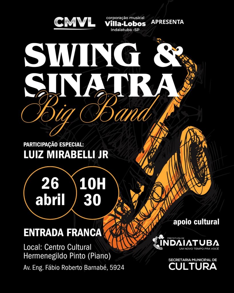 No dia 26 de abril, às 10h30, a Big Band da Corporação Musical Villa-Lobos apresenta o concerto especial “Swing & Sinatra”, no Centro Cultural Hermenegildo Pinto (Piano), em Indaiatuba. O evento conta com o apoio da Prefeitura de Indaiatuba, por meio da Secretaria Municipal de Cultura. A entrada é gratuita e o acesso será por ordem de chegada.