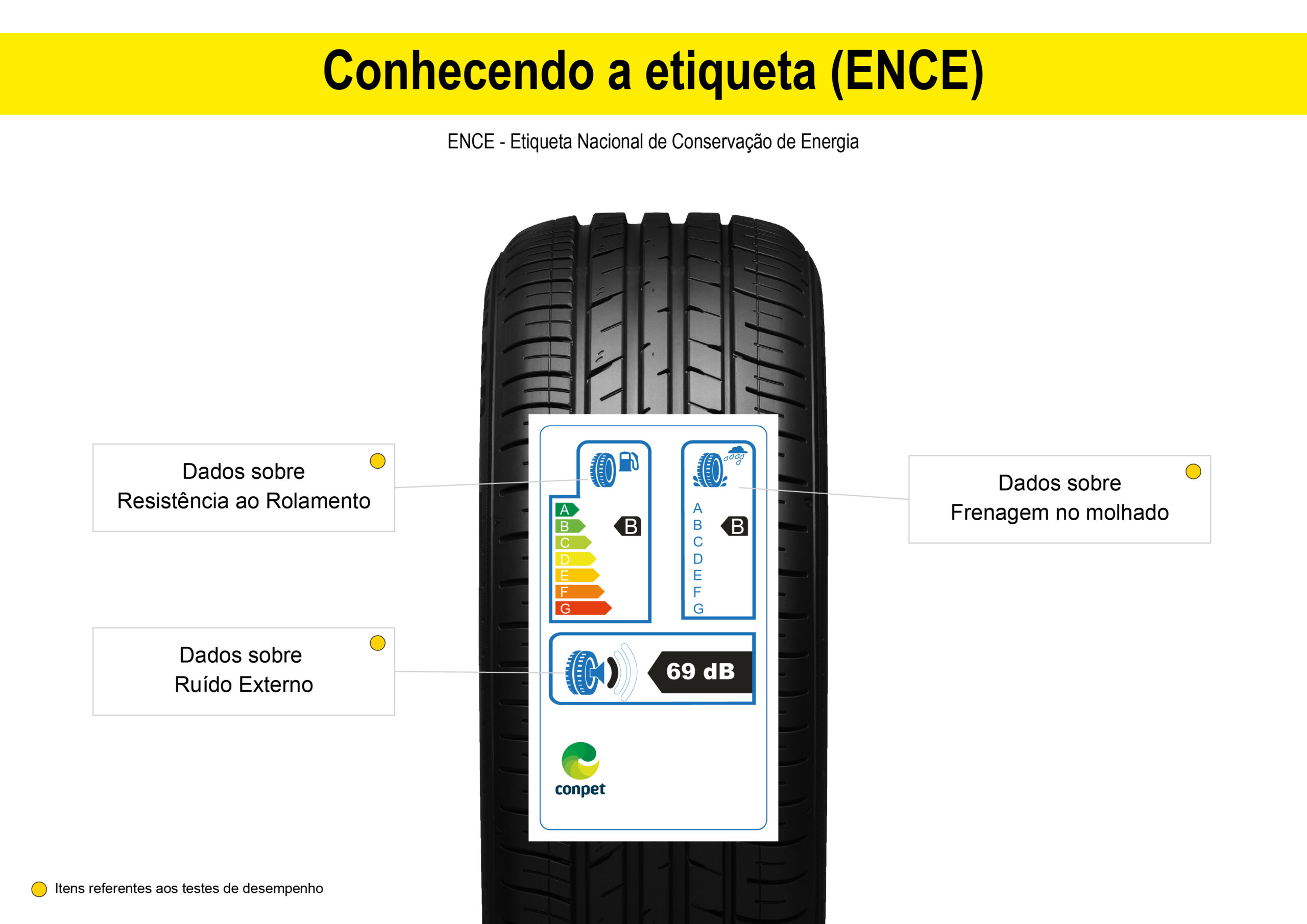 Desde 2012, todos os pneus vendidos no Brasil devem exibir a Etiqueta Nacional de Conservação de Energia (ENCE), conforme regulamentação vigente no país. Ela fornece informações importantes sobre o desempenho do pneu em três categorias: