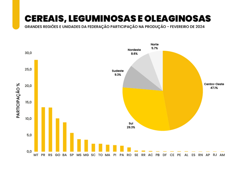 Já a cevada em grão tem a produção estimada em 411,9 mil toneladas. Também com aumento de 8,6% em relação à produção do ano passado. Os maiores produtores de cevada são o Paraná — com 278,0 mil toneladas — e o Rio Grande do Sul, com 110,5 mil toneladas. Estados que devem ser responsáveis por 94,3% da produção brasileira de cevada em 2024.