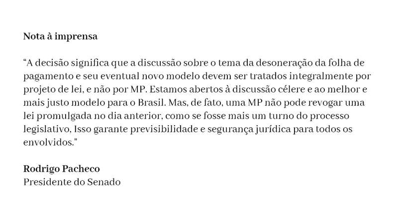 No ultimo dia 1º o presidente do Senado, Rodrigo Pacheco, tornou sem efeito a Medida Provisória 1.202/2023, apresentada pelo Palácio do Planalto e que revogava a desoneração da folha de pagamento dos municípios.