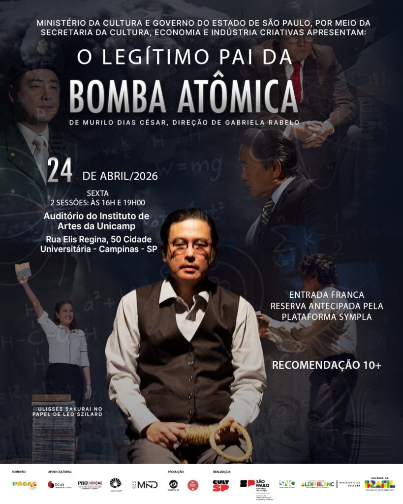O espetáculo teatral O Legítimo Pai da Bomba Atômica será apresentado em Campinas (SP) nesta sexta-feira, 24 de abril, no auditório do Instituto de Artes da Unicamp, em duas sessões: 16h e 19h. A peça leva ao palco reflexões sobre ciência, política, ética e os impactos da criação da bomba atômica, ampliando debates que ganharam visibilidade recentemente com o sucesso do filme Oppenheimer. A entrada é gratuita, limitada à capacidade do espaço.