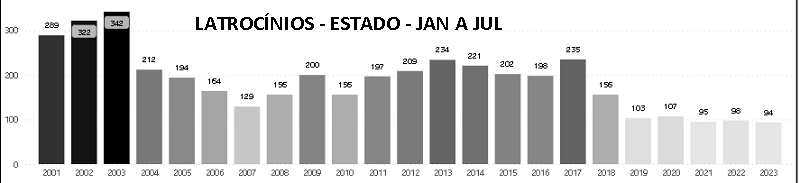 Os roubos de veículo encerraram os sete primeiros meses do ano com 21.415 casos, registrando recuo de 3,4%. Em julho, passou de 3.332 para 2.841, queda de 14,7%. Já os a banco foram de 10 para 6 registros no acumulado e de 2 para 1 no mês.