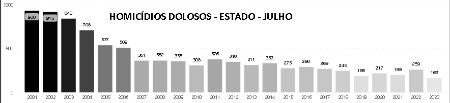 Os homicídios dolosos, por sua vez, bateram novo recorde. Foram 1.489 casos nos sete primeiros meses, 10% a menos do que os 1.654 registrados em igual período de 2022. No mês passado, a queda foi de 37,5%, de 259 para 162. As reduções em julho e no acumulado são as menores registradas desde 2001, quando a série histórica foi iniciada.