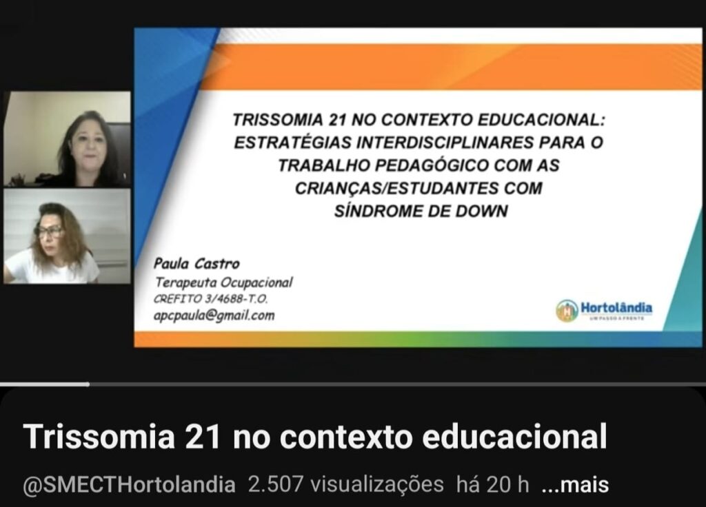 Nesta segunda-feira (30/03), aconteceu o webinário “Trissomia 21 no contexto educacional: estratégias interdisciplinares para o trabalho pedagógico com as crianças/estudantes com Síndrome de Down”. O evento online foi transmitido ao vivo e está disponível no canal oficial da Secretaria no YouTube. O encontro contou com duas convidadas: Milena Oliveira, Coordenadora Pedagógica da Educação Especial, e Paula Castro, Terapeuta Ocupacional da equipe da Educação Especial, oferecendo ferramentas fundamentais para educadores e familiares.