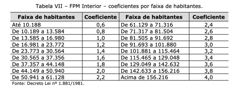 Quanto maior o número de habitantes, maior o coeficiente individual de participação, como mostra a tabela abaixo.