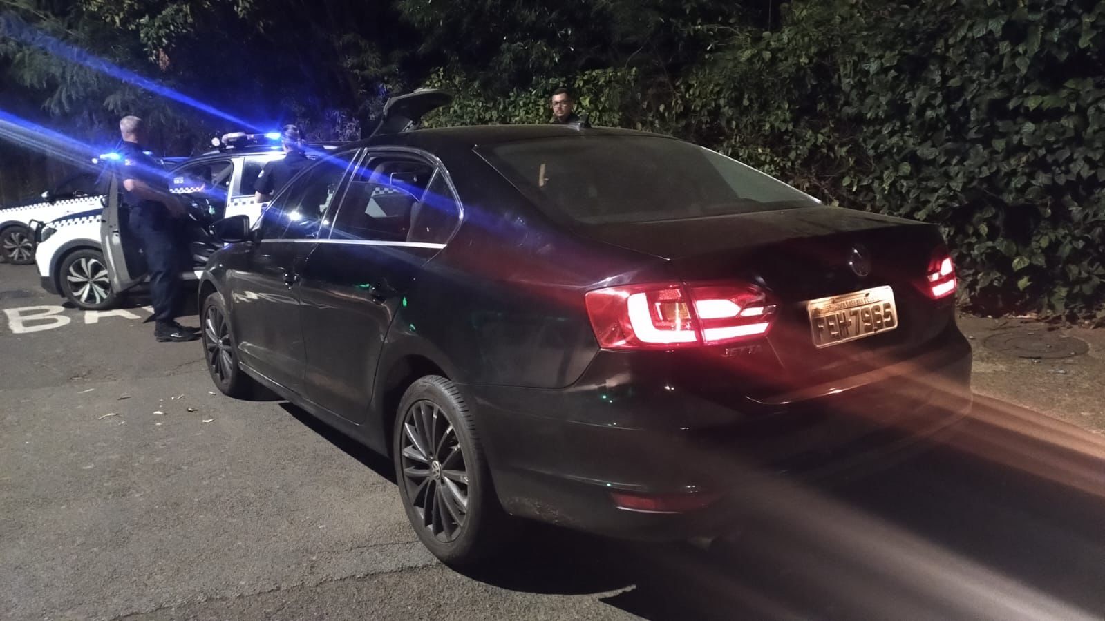Durante um patrulhamento de rotina, a equipe da Guarda Municipal, composta pelos subinspetores Aguilera e Friebolim, notou um veículo VW Jetta de cor preta com três ocupantes, que transitava em baixa velocidade. Ao perceber a aproximação da viatura, o motorista acelerou e iniciou uma fuga. Após perseguição e quatro sinais sonoros e luminosos ignorados, o veículo foi abordado na Rua Abrahim Abraham, em frente à APAE.