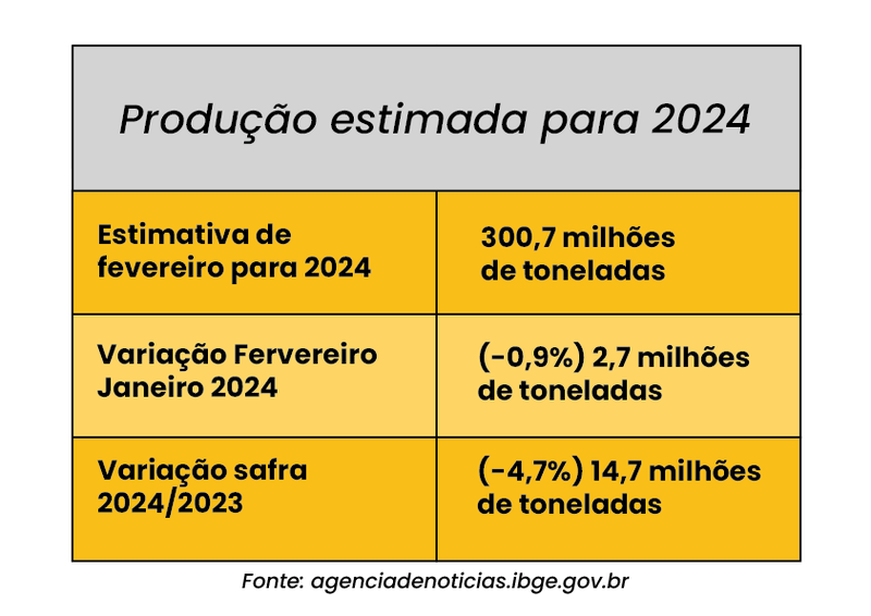 O resultado apresentado pelo IBGE vem alinhado com a última pesquisa da Companhia Nacional de Abastecimento, a Conab, que também apresentou redução da safra de grãos com relação a 2023, com queda de 7,6%.
