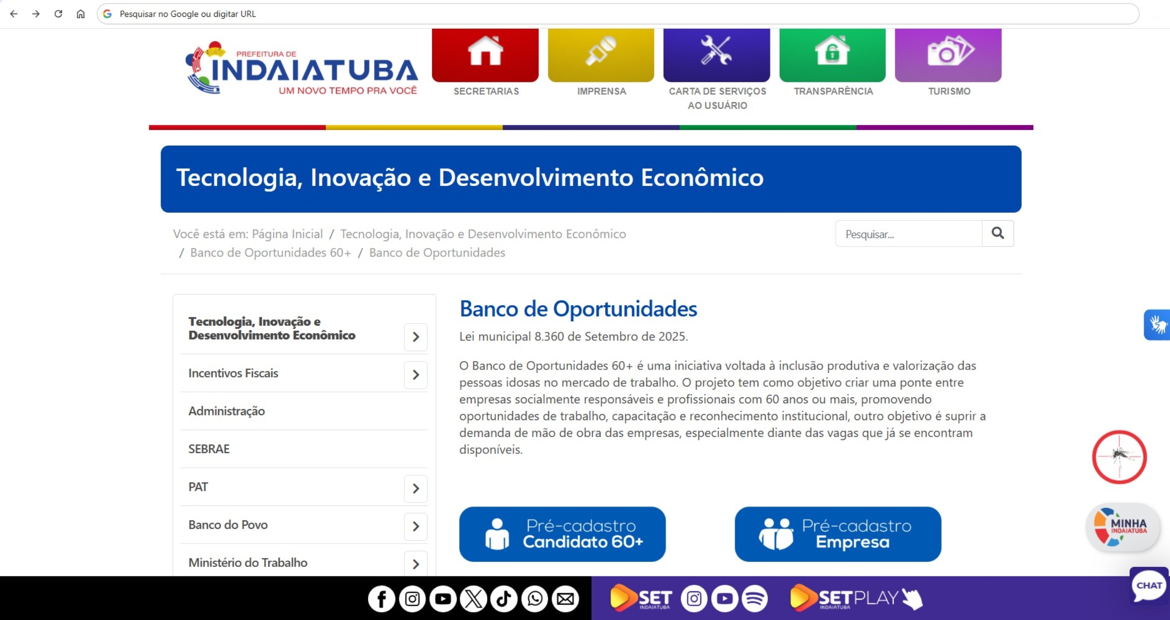 A Prefeitura de Indaiatuba, por meio da Secretaria de Tecnologia, Inovação e Desenvolvimento Econômico, disponibilizou em seu site a nova área do Banco de Oportunidades 60+, localizada na página da própria secretaria.A iniciativa foi criada a partir da Lei Municipal nº 8.360/2025, sancionada em setembro pelo prefeito Dr. Custódio Tavares (MDB). A legislação institui o programa “De Volta ao Trabalho”, que tem como objetivo incentivar a inserção e a permanência de pessoas idosas no mercado de trabalho.
