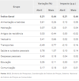 Segundo os resultados da pesquisa, oito dos nove grupos de produtos e serviços pesquisados tiveram resultados positivos em maio, sendo que as maiores variações estão nos setores de Saúde e cuidados pessoais, com 1,07% e 0,14 p.p, e Transportes, com 0,77% e 0,16 p.p. As demais variações ficaram entre o -0,44%, nos setores de Artigos de residência e 0,66% no de Vestuário.