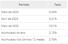 No ano, o IPCA-15 acumula alta de 2,12% e, em 12 meses, de 3,70%, abaixo dos 3,77% observados nos 12 meses anteriores. Em maio de 2023, a taxa foi de 0,51%.