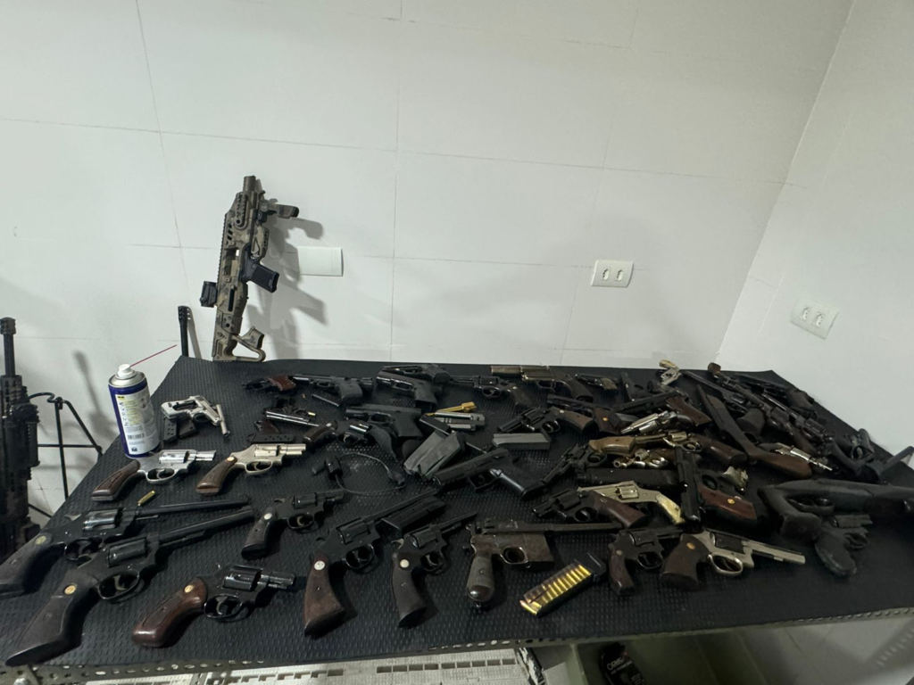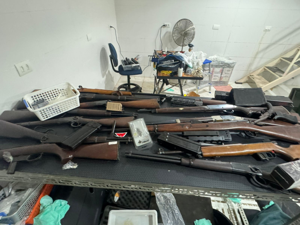 No imóvel, os policiais encontraram atrás do guarda-roupa um compartimento secreto que levava a um bunker sofisticado usado para guardar armamentos. Ao todo, foram apreendidas 152 armas, sendo que 87 delas não estavam legalizadas. Munições e acessórios relacionados também foram apreendidos.