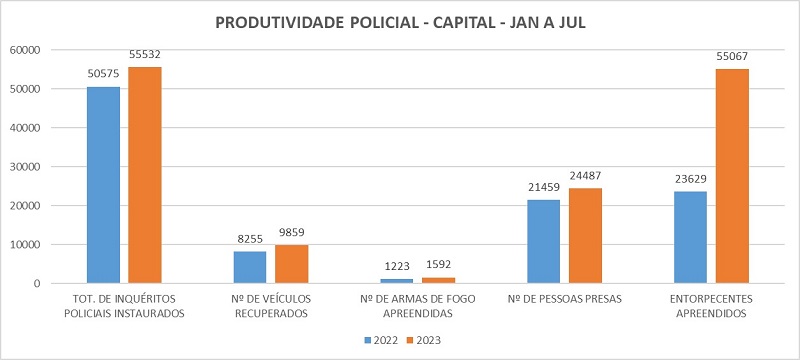Até julho, a Polícia Civil instaurou 55.532 inquéritos policiais – aumento de 9,8% quando comparado com mesmo período de 2022. Somente em julho a alta foi de 9%, com 7.808 inquéritos.