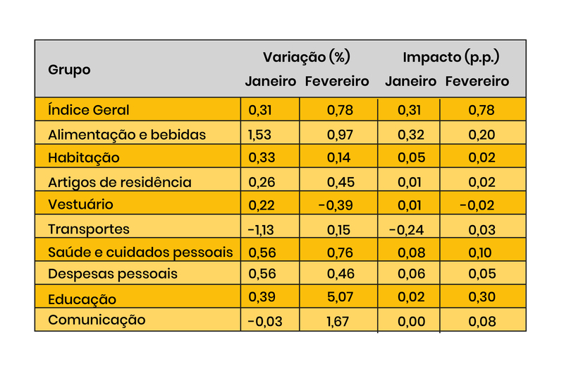 O grupo de Alimentação e Bebidas, mesmo com aumento menor (0,97%), teve impacto significativo no mês, de 0,20 p.p.