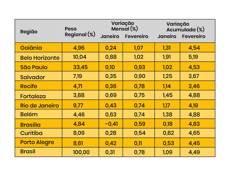 Essa inflação de 0,78 ajudou a produzir uma inflação anualizada de 4,49% — “um aumento meramente marginal se comparar com os 12 meses encerrados em janeiro”, explica André Galhardo. Segundo o IBGE a inflação acumulada em 12 meses, encerrada em janeiro, foi de 4,47%, um aumento bem pequeno.