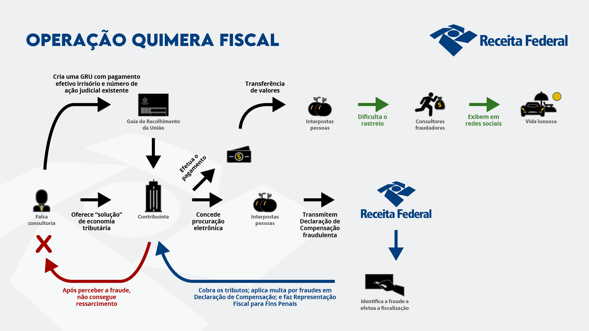 A Receita Federal, em conjunto com a Polícia Federal, deflagrou, na manhã desta quarta-feira (10), a Operação “Quimera Fiscal”. O objetivo é obter provas adicionais relativas à estrutura de consultoria que abusa do instituto da Declaração de Compensação e que continuou a perpetrar fraudes mesmo após ser alvo da Operação Ornitorrinco, em 13 de março de 2024. São investigados possíveis crimes de falsidade de documentos e de lavagem de dinheiro.