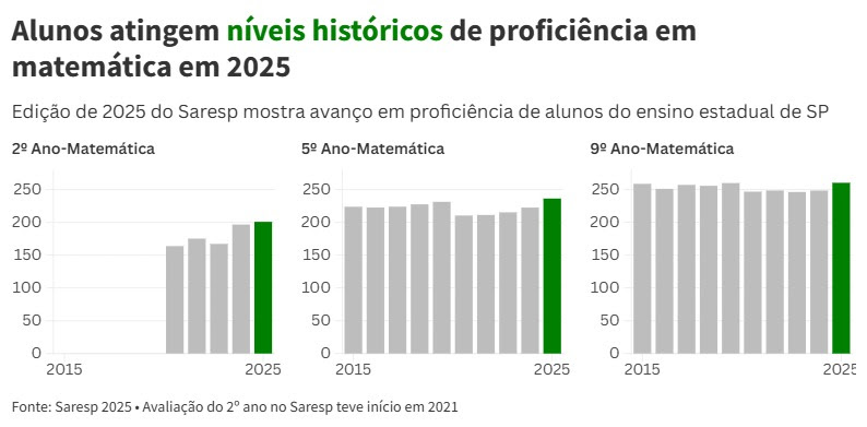 Em 2025, São Paulo alcançou o melhor desempenho da série histórica em matemática no Ensino Fundamental, com avanço no 2º, 5º e 9º anos, segundo dados do Saresp.