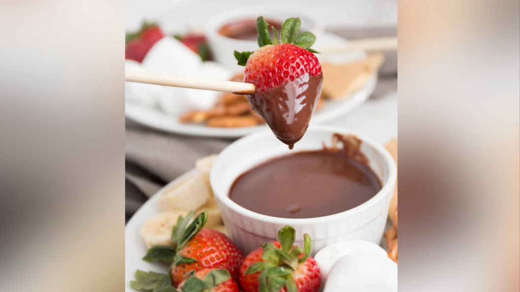 Derreta o chocolate, misture com creme de leite e sirva quente com frutas, biscoitos ou pedaços de bolo.