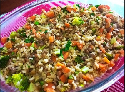 - Almoço: Lentilha com arroz integral e legumes. A combinação é fonte de proteína vegetal, ferro, fibras e magnésio. Os ingredientes são cozidos separadamente e depois misturados com legumes refogados.