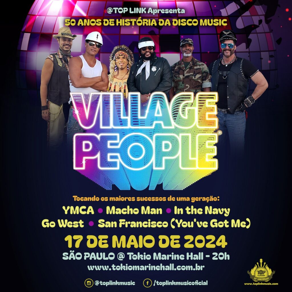 Village People no Brasil Data: 17 de maio de 2024 (sexta-feira) Local: Tokio Marine Hall – São Paulo/SP Endereço: R. Bragança Paulista, 1281 – Várzea de Baixo Horário: 22 horas (show) Ingressos: entre R$ 90 e R$ 400 Venda online: https://www.eventim.com.br/artist/village-people